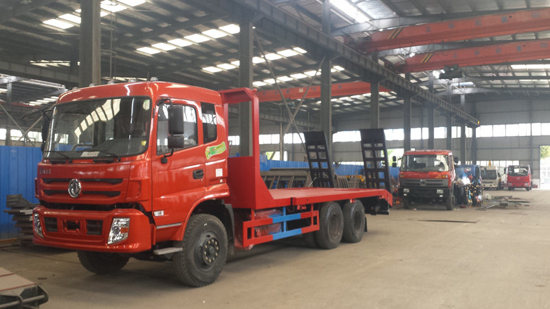 东风特商后八轮挖机拖车重载型上装横梁采用15*15规格8mm厚方钢,货箱平板8mm厚花纹板或者10个厚花纹板或者平板